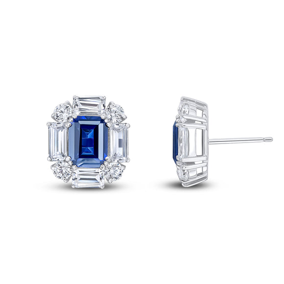 The Gillian earrings feature an 8x6mm sapphire colour emerald-cut cubic zirconia centre with a white baguette and round surround. These earrings are set in rhodium-plated sterling silver with a post and butterfly fitting.