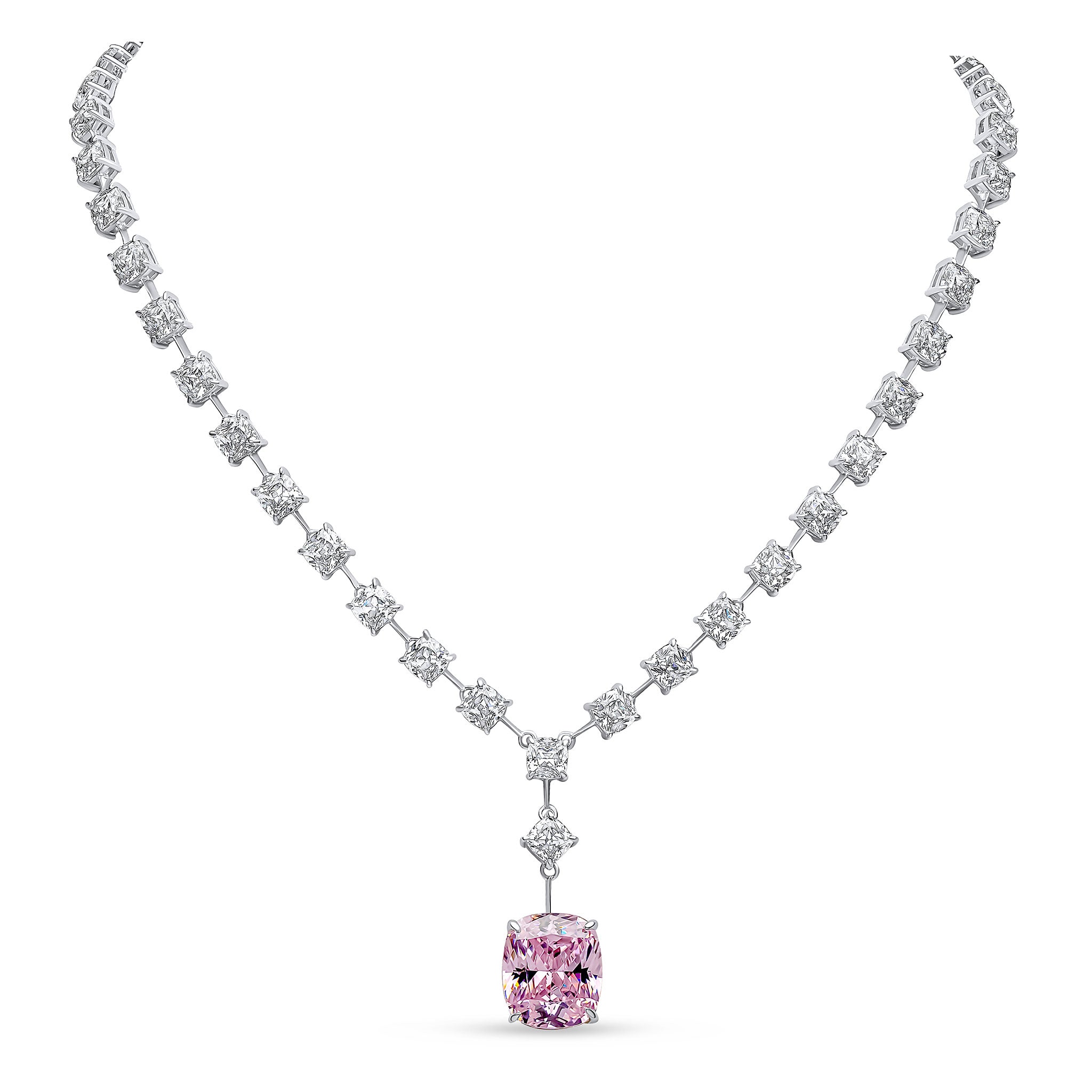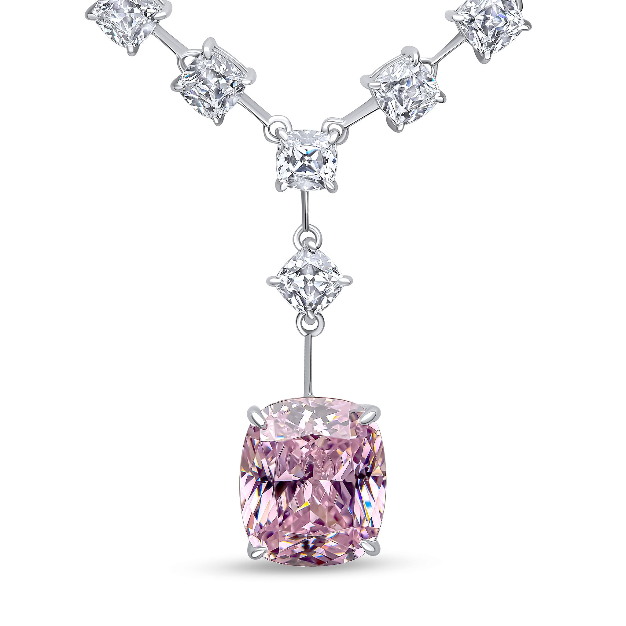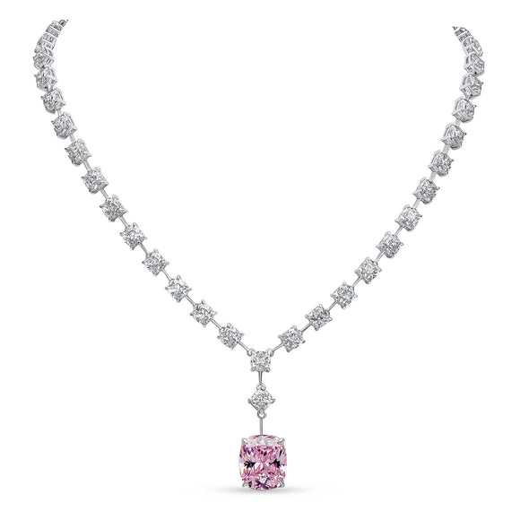 The Imelda necklace features approximately 16" of 5x5mm white cushion cubic zirconia stones with a 14x12mm pink radiant-cut drop front. This necklace is set in rhodum-plated sterling silver.
