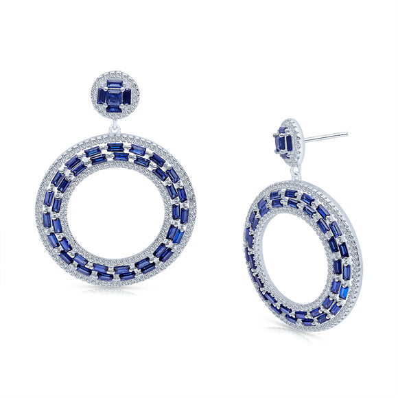 The Irena drop earrings feature sapphire baguette cubic zirconia stones  with surrounding white pavé stones. These earrings are set in rhodium plated sterling silver with a post and butterfly fitting.