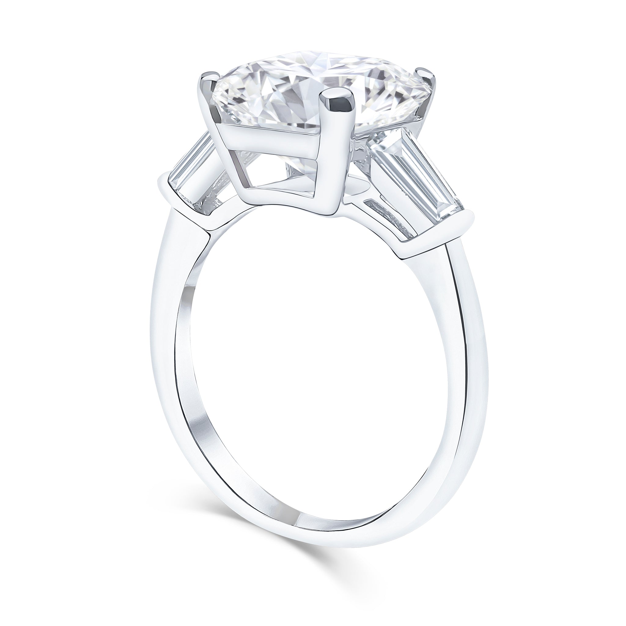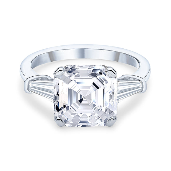 The Ivy ring features a white 10x10mm asscher cubic zirconia centre stone with baguette shoulders set in rhodium-plated sterling silver.