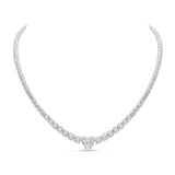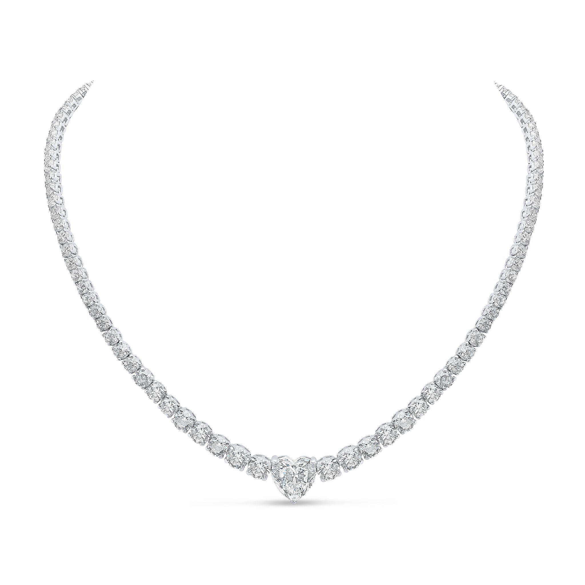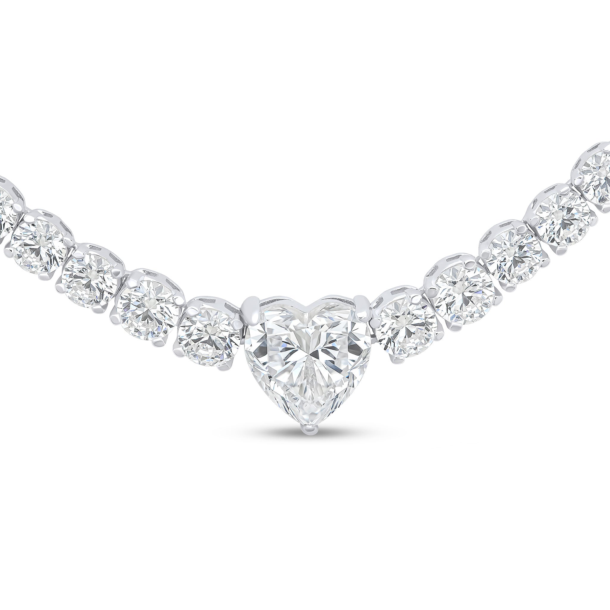 The Khloe necklace features graduated all-white round cubic zirconia stones with a 10x10mm white heart stone front. This necklace is set in rhodium plated sterling silver and measures approximately 15" in length.
