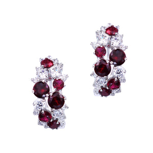 The Livia earrings feature a cluster of marquise and round brilliant white and ruby cubic zirconia stones, set in rhodium-plated sterling silver with post and omega fittings.
