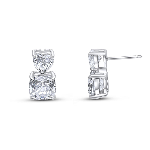 The Lovey earrings feature a 6x6mm heart-shaped cubic zirconia top and a static 8x8mm cushion-cut drop. These earrings are set in rhodium-plated sterling silver with a post and butterfly fitting.