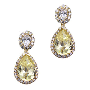 The Lynn earrings feature a 15mm canary cubic zirconia pear shaped drop and a 7mm white oval top surrounded by white stones, set on gold-plated sterling silver.