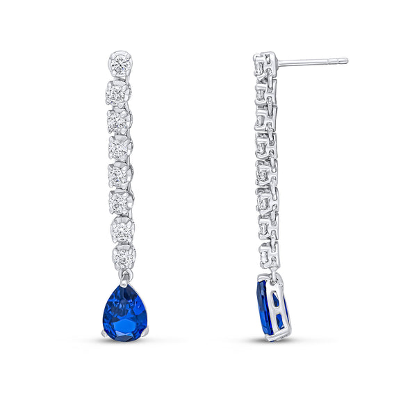 The Maddy earrings feature a stem of 3mm round white cubic zirconia stones with a 6x8mm sapphire pear-shaped drop. These earrings are set in rhodium-plated sterling silver with a post and butterfly fitting.