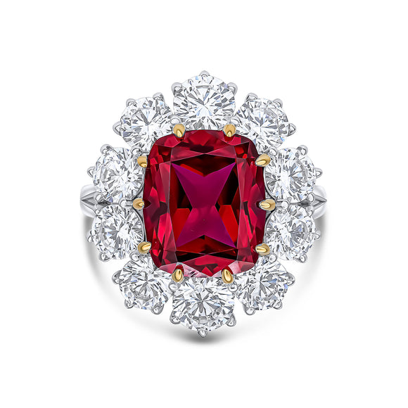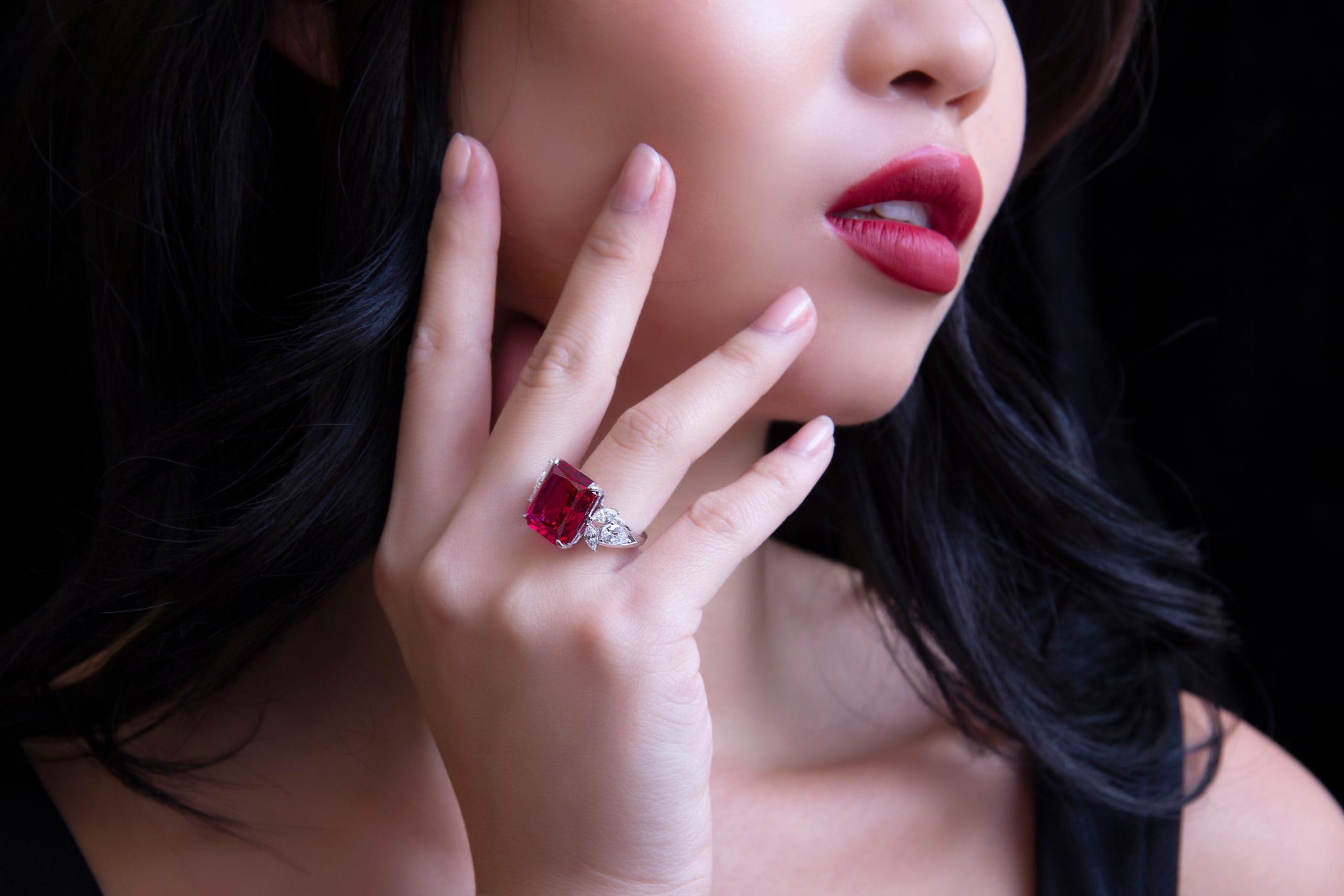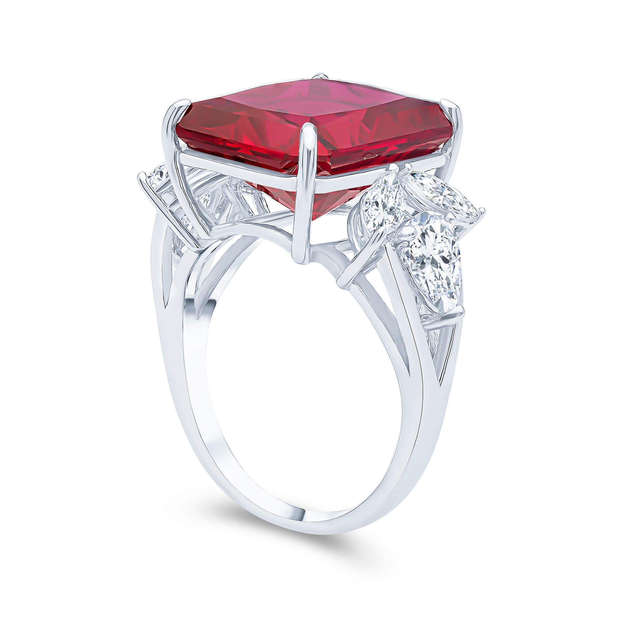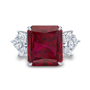 The Maisie ring features a 12x15mm ruby princess-cut cubic zirconia stone with white marquise and pear shoulders. This ring is set in rhodium-plated sterling silver with a narrow band.