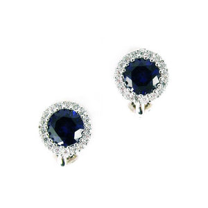 The Margot clip-on earrings feature a round sapphire cubic zirconia centre surrounded by pavé white stones, set in rhodium-plated sterling silver.