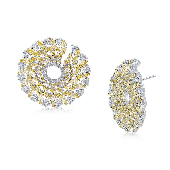 The Marie earrings feature fan-like discs of canary marquise and round white cubic zirconia stones set in two-tone plated sterling silver with a post and butterfly fitting. The discs measure approximately 34x34mm.