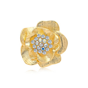 The mini Magnolia brooch features a cluster of white crystals surrounded by gold-plated metal double layer of petals.