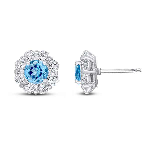 The Naomi earrings feature a 6.5mm round aqua cubic zirconia centre stone with an all white stone surround. These earrings are set in rhodium-plated sterling silver with a centre post and butterfly fitting.