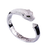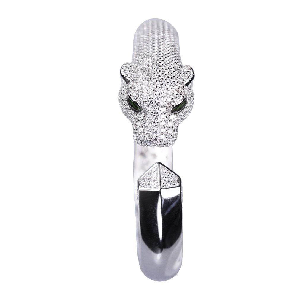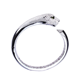 The Panther bangle features white pavé cubic zirconia stones and dark peridot marquise eyes. This bangle is beautifully set in rhodium-plated sterling silver with filigree detail on the interior.