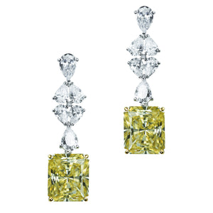The Rea earrings feature a long stem of white pear-shaped cubic zirconia stones with a 12x14mm canary radiant stone drop. These earrings are set in rhodium plated sterling silver and have a post and butterfly fitting.