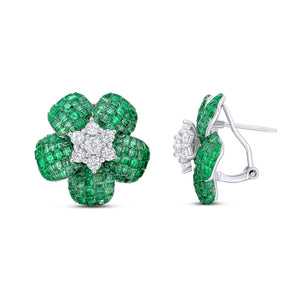 The Rhoda earrings feature invisibly-set emerald cubic zirconia stones with a round white cluster stone centre. These earrings are set in rhodium-plated sterling silver with a post and omega fitting.