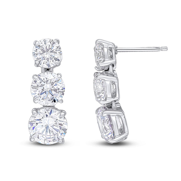 The Rosetta earrings feature graduated round all-white cubic zirconia stones of sizes 6, 7 and 8mm. This earring is set on rhodium-plated sterling silver with a post and butterfly fitting. There is a slight movement to this earring, the stones are not entirely static.