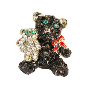 The Teddy Bear pin features black and white crystals with green eyes and a red enamel bow, set in rhodium-plated base metal.