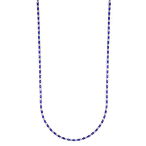 The Vicky long tennis necklace features alternating 3mm round white and sapphire cubic zirconia stones, set in rhodium-plated base metal.