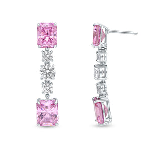 The Whitney drop earrings feature 9x7mm pink radiant cubic zirconia stones and a stem of white round stones. The earrings are set on rhodium plated sterling silver with a post and butterfly fitting.