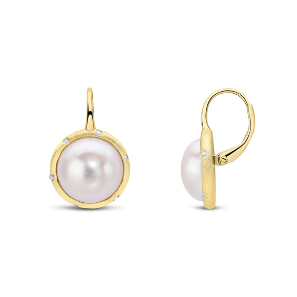 The Adelaide earrings feature a 12.5mm white mabe freshwater pearl with scattered small white cubic zirconia stone detail. These earrings are set on a satin-finish gold plated sterling silver with a shepherds hook fitting.