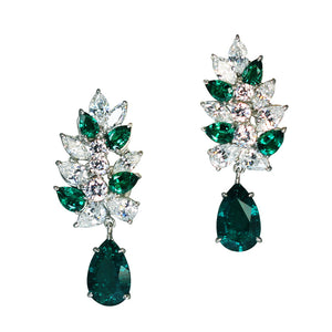 It features a cluster of white and emerald cubic zirconia pear, round and marquise shaped stones with an emerald pear shape drop, set in rhodium-plated sterling silver.