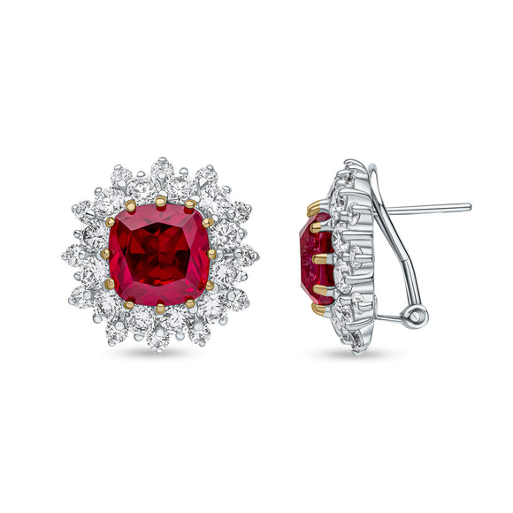 The Amira earrings feature 11x11mm ruby cushion-cut centre stones and two rows of white round stones. These earrings are set on two-tone plated sterling silver with a post and omega fitting.