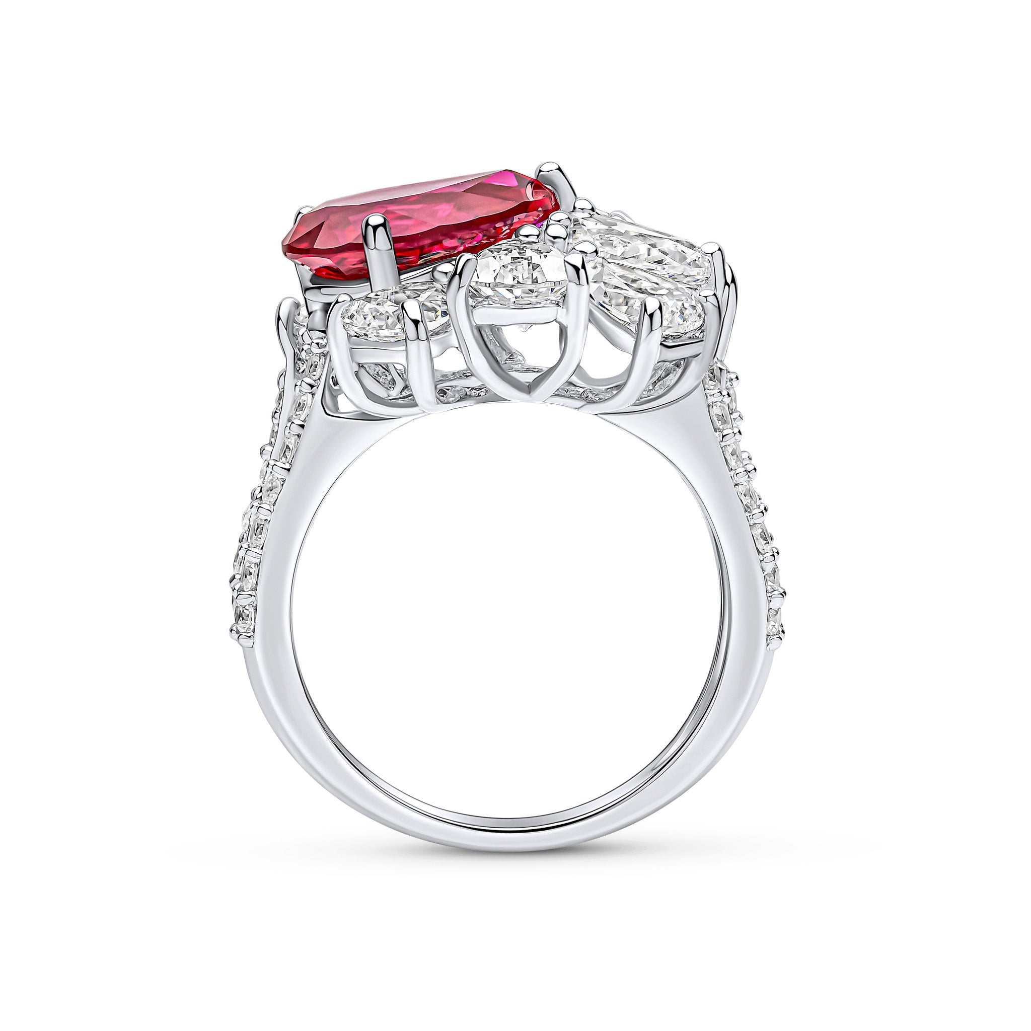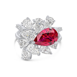 The Andi ring features a 13x8mm pear-shaped ruby cubic zirconia centre stone with a cluster of white pear stones and two rows of pavé stones. This ring is set in rhodium-plated sterling silver.