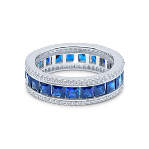 The Anna-lisa full-eternity ring features a centre row of sapphire princess-cut cubic zirconia stones with two pavé white stone outer rows. This ring is set in rhodium plated sterling silver with a channel-set edge.