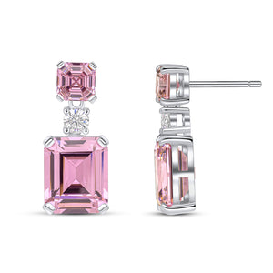 The Annette earrings feature a pink 10x12mm emerald-cut cubic zirconia drop with a 4mm white round centre and a pink 6x6mm asscher-cut top. These earrings are set in rhodium-plated sterling silver with a post and butterfly fitting.