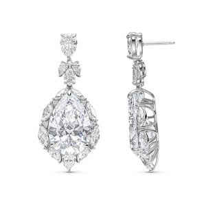 The Arabella drop earrings feature a central 23x15mm pear drop with marquise, round and pear all-white cubic zirconia surround and top detail. These earrings are set in rhodium-plated sterling silver with a post and butterfly fitting.