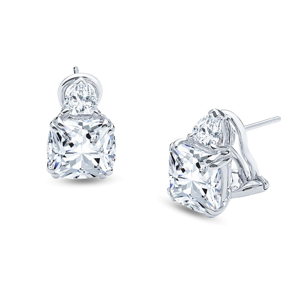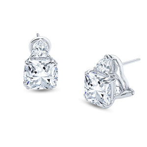 The Brooke earrings feature a 10x10mm white cushion-shaped cubic zirconia stone with a white heart stone top. This earring is rhodium plated sterling silver with a post and omega fitting.