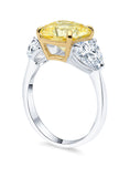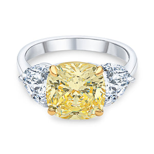 The Brooke ring features a 10x10mm canary cushion-shaped cubic zirconia centre stone with white heart stone sides. This ring is two-tone gold and rhodium plated sterling silver.