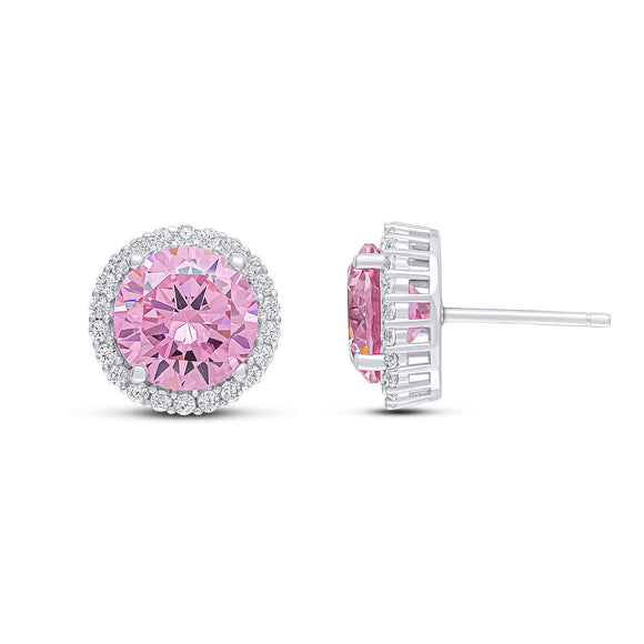 The Carla earrings feature a 10mm round pink cubic zirconia centre stone with white pavé surrounding stones. These earrings are set on rhodium-plated sterling silver with a centre post.