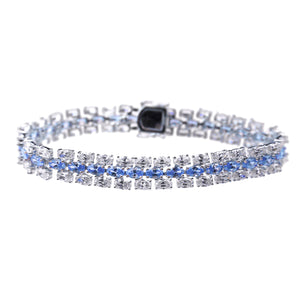 The Cordelia bracelet features three rows of 3x5mm white and aqua oval-shaped cubic zirconia stones, set in rhodium-plated sterling silver. This bracelet is available in 7" only and has a double figure-8 safety clasp.