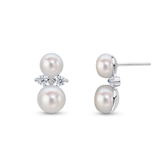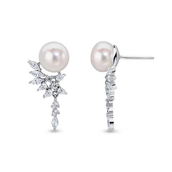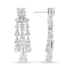 The Desdemona earring features a chandelier of all white asscher, pear and radiant-shaped cubic zirconia stones. These earrings are set in rhodium-plated sterling silver with a post and butterfly fitting.