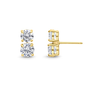 The double Vesper stud earrings feature two static white round cubic zirconia stones measuring 6mm and 6.5mm. These earrings are set on gold-plated sterling silver with a centre post and butterfly fitting.