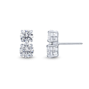 The double Vesper stud earrings feature two static white round cubic zirconia stones measuring 6mm and 6.5mm. These earrings are set on rhodium-plated sterling silver with a centre post and butterfly fitting.