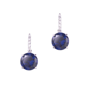 The Eurydice earrings feature a 10mm round sapphire cubic zirconia stone drop with small white pavé cubic zirconia stones on top.