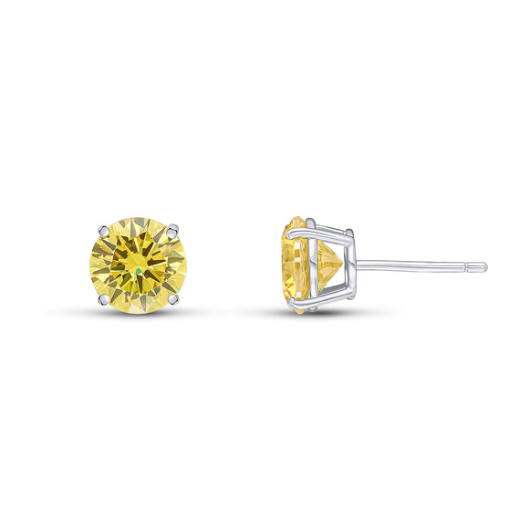 The Eva stud earrings feature an 8mm round deep yellow cubic zirconia stone set in rhodium-plated sterling silver. These earrings have a post and butterfly fitting.