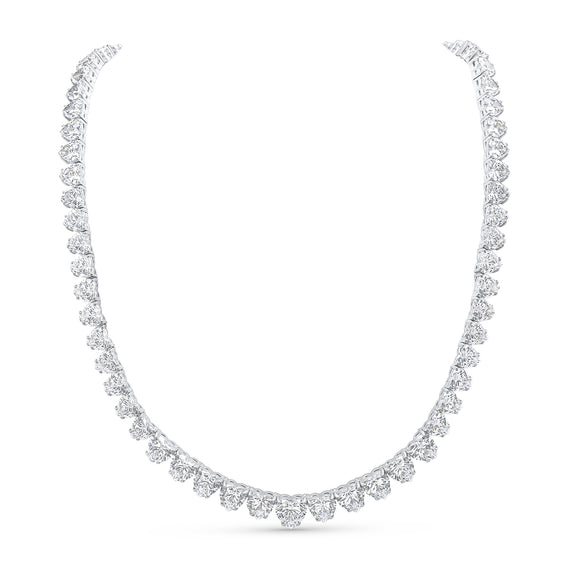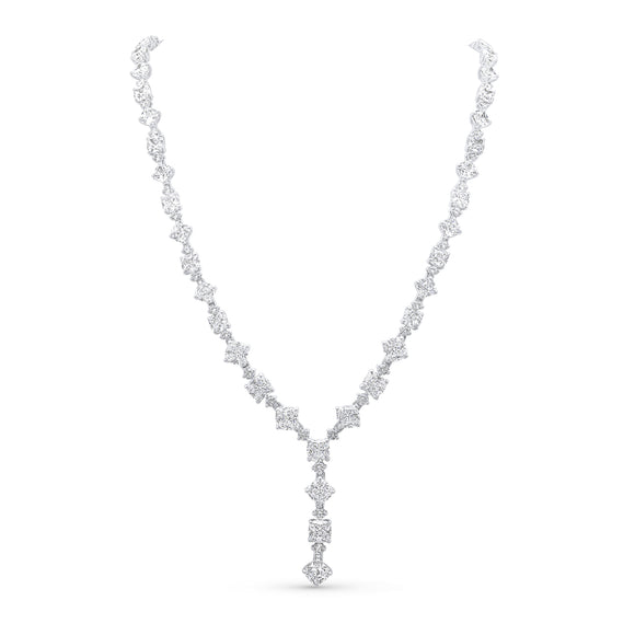 The Flo long necklace features 32" of all white 3mm round cubic zirconia stones with scattered sapphire marquise flower stations. This necklace is set in two-tone rhodium and yellow gold plated base metal.