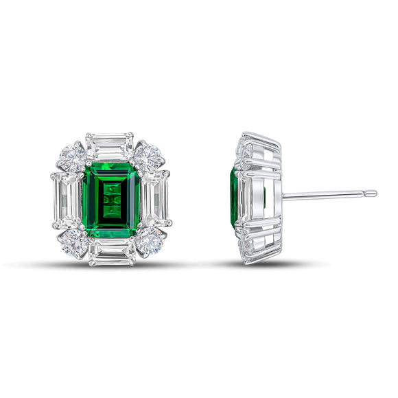 The Gillian earrings feature an 8x6mm emerald colour emerald-cut cubic zirconia centre with a white baguette and round surround. These earrings are set in rhodium-plated sterling silver with a post and butterfly fitting.