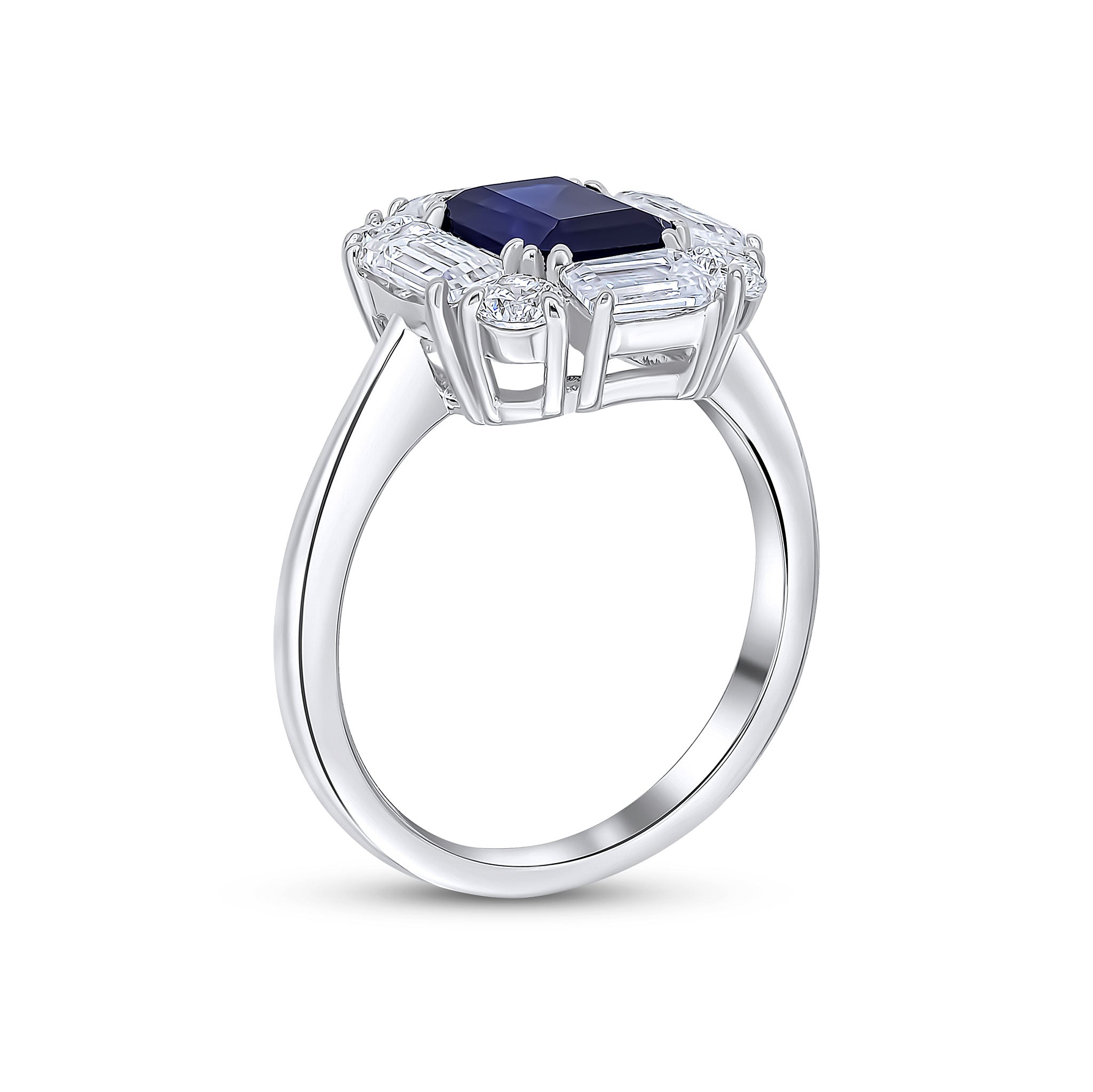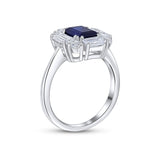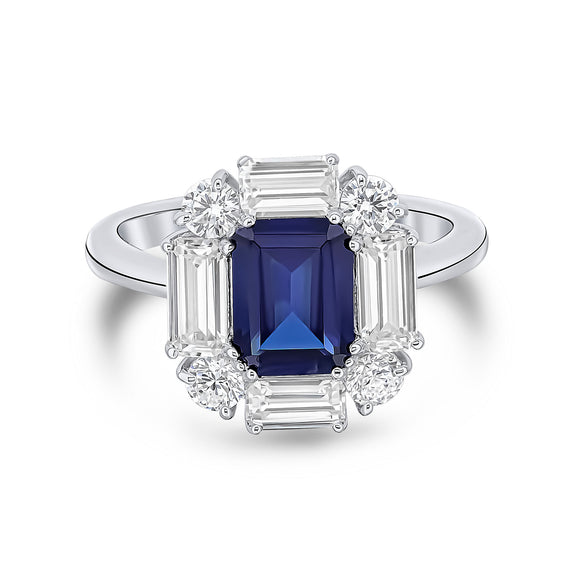 The Gillian ring features an 8x6mm sapphire colour emerald-cut cubic zirconia centre with a white baguette and round surround. This ring is set in rhodium-plated sterling silver with a polished band.