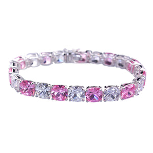 Havana bracelet features alternating 8x8mm pink and white cushion-shaped cubic zirconia stones, set in rhodium-plated sterling silver.