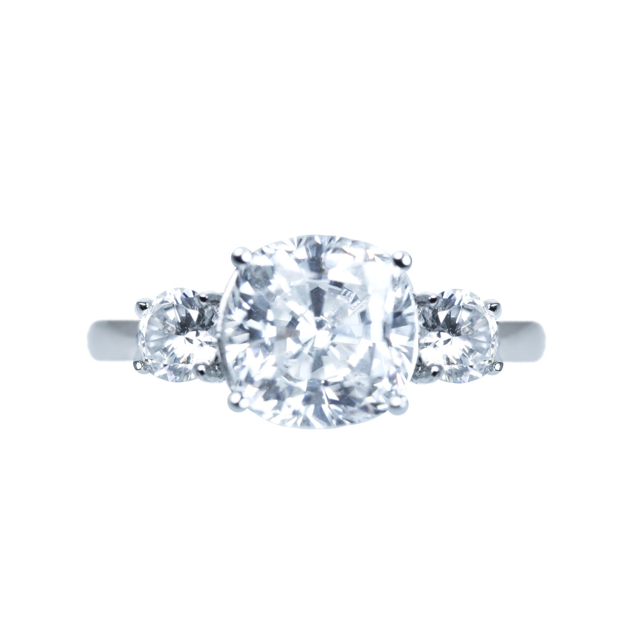 The Holly ring features a white 9x9mm cushion centre cubic zirconia centre with white round brilliant side stones. This ring is set in rhodium plated sterling silver.