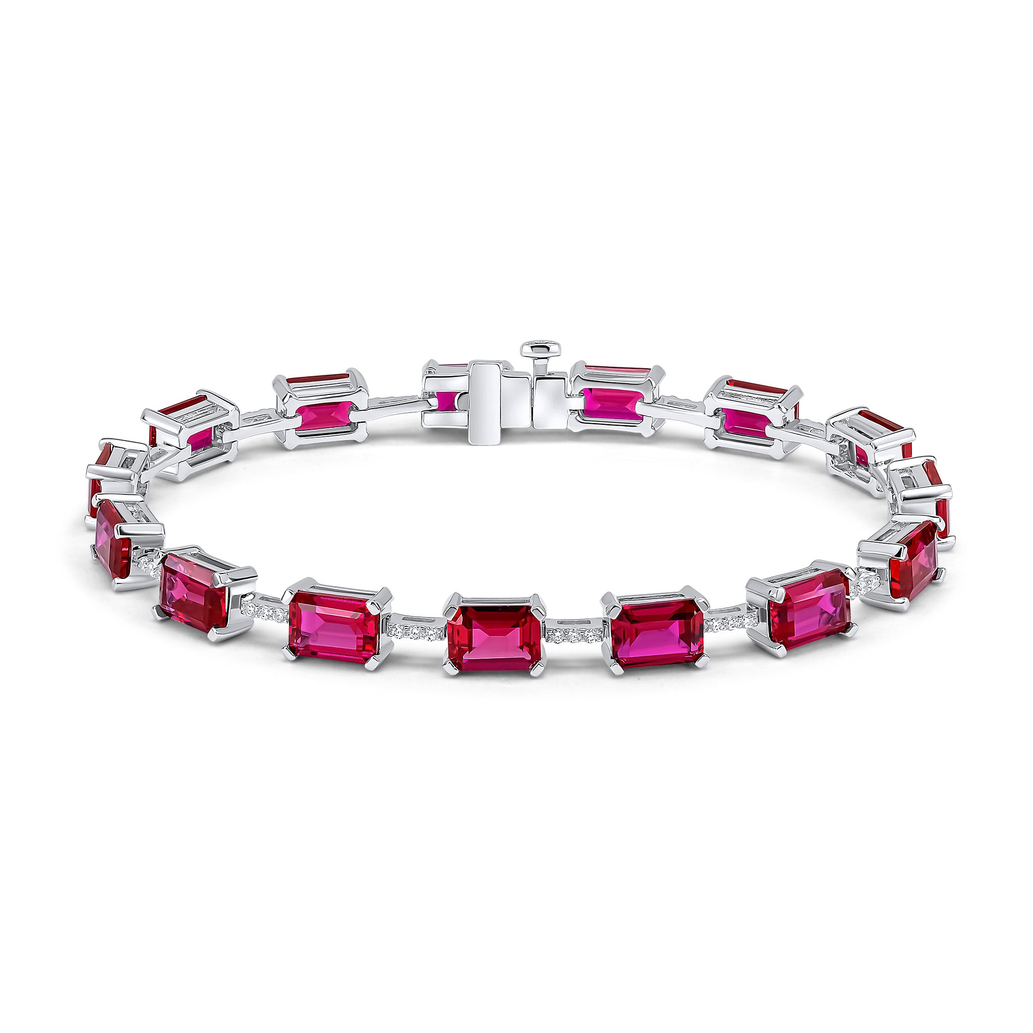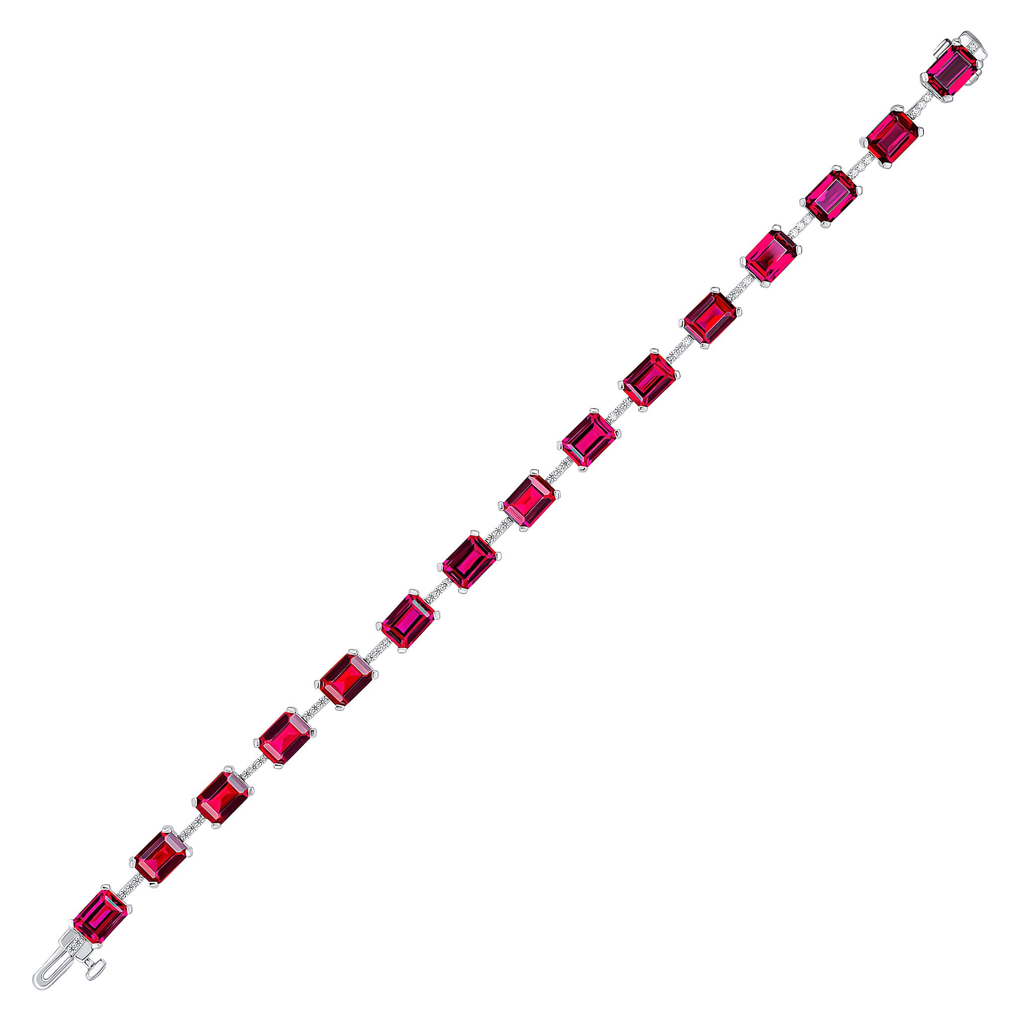 The Irena bracelet features 7x5mm pinkish-ruby colour emerald-cut cubic zirconia stones with white pavé lines set on rhodium plated sterling silver with a hidden safety clasp.