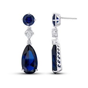 The Juliette earring features an 8mm round sapphire cubic zirconia top, a 5mm round white stone centre and a 20x10mm sapphire pear drop with a very discreet small round white stone at the tip. These earrings are set on rhodium plated sterling silver with a post and butterfly fitting and filigree detail on the pear-drop setting.