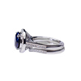 The Kathy ring set features a 10mm round sapphire cubic zirconia centre stone surrounded by white micro pavé stones partnered with a half eternity all white micro-pavé ring. This ring duo is set in rhodium-plated sterling silver.