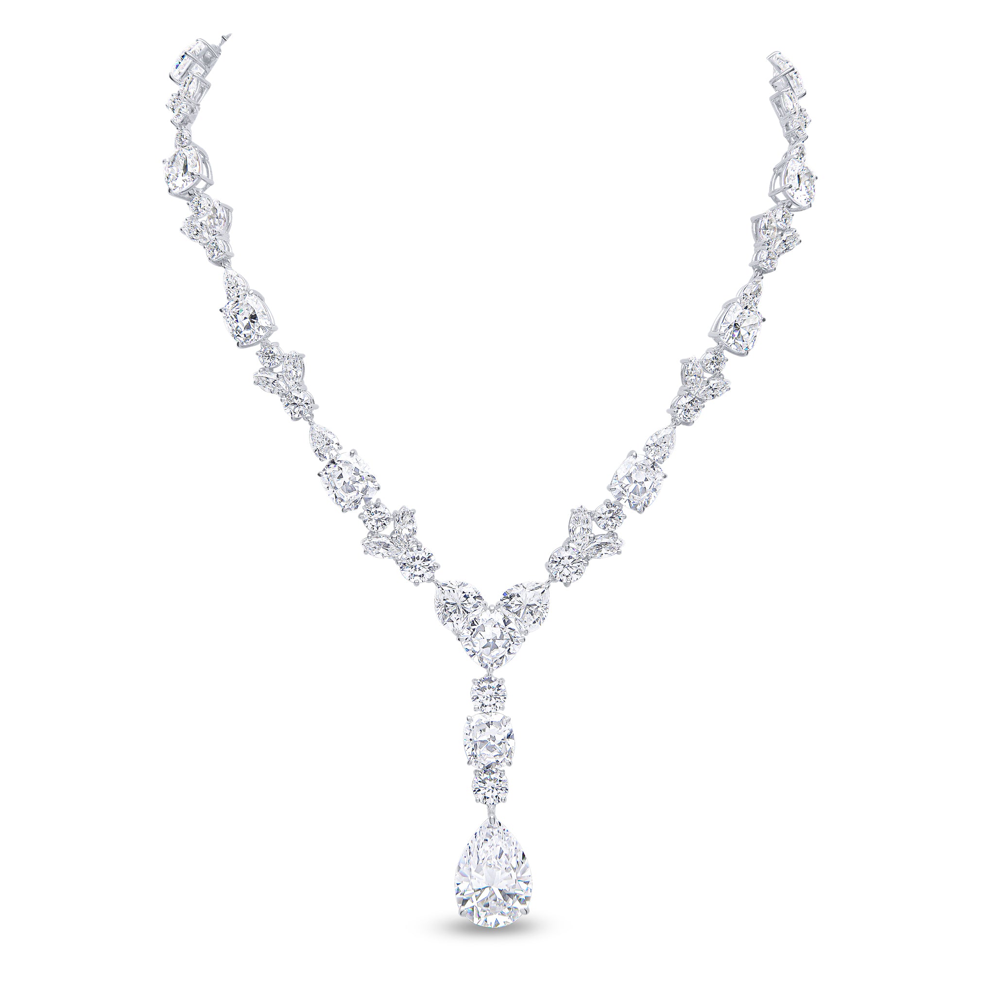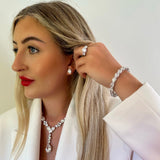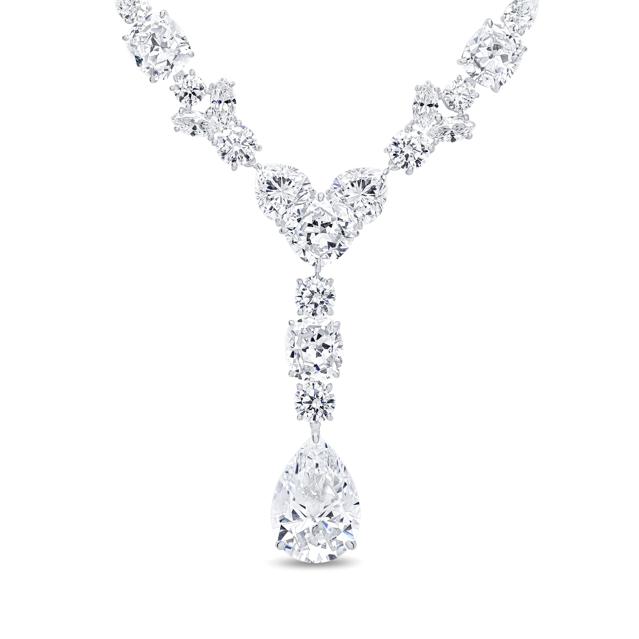 The Lorena necklace features all-white multi-cut cubic zirconia stones (marquise, pear, round, cushion and heart) with a 21x14mm pear drop. This necklace is set on rhodium-plated sterling silver with a figure-8 safety clasp at the back.