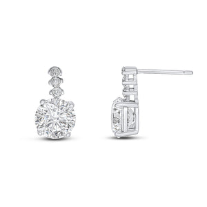 The Madison earrings feature all-white cubic zirconia stones with a three-stone bar and a 8mm round static drop. These earrings are set on rhodium plated sterling silver with a post and butterfly fitting.