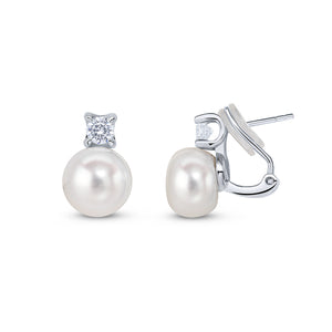 The Magda pearl earrings feature a static 11-11.5mm white button freshwater pearl bottom and a 4mm round white stone top. These earrings are set in rhodium-plated sterling silver with a post and omega fitting.