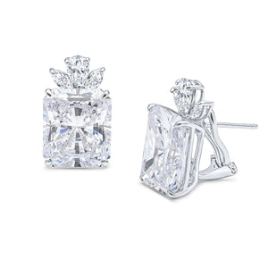 The Maisie earrings feature a white 12x14mm radiant cut cubic zirconia stone with pear and marquise stones on top, set in rhodium-plated sterling silver with a post and omega fitting.