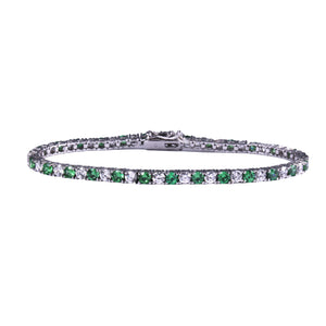 The Martina tennis bracelet features alternating 3mm round emerald and white cubic zirconia stones, set in rhodium-plated sterling silver.